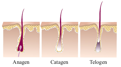Hair growth cycle. Anagen is the active growth phase, catagen is the regression phase, telogen is a resting phase. There is sometimes mild pain associated with laser treatments. This discomfort ranges in intensity and has been described from as mild as the snap of a rubber band, to the sensation of a hot pinprick. When treating sensitive areas, (upper lip and bikini areas) some practitioners often elect to use a topical anaesthetic cream, which helps to reduce any discomfort.