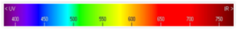 This chart shows colors of the visible light spectrum, and the associated wavelengths in nanometers. Ranges are traditionally given as: ultraviolet light, 100-400 nm; visible light, 400-750 nm; and infrared, 750 nm-1 mm.