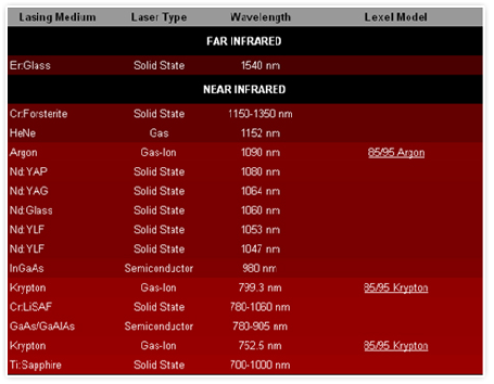 The absorption of various chromophores as a function of wavelength. Ruby lasers operate at 694 nm, alexandrite lasers at 755 nm, diode lasers at 800 nm and Nd:YAG lasers at 1064 nm.