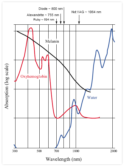 Wavelengths between approximately 700 and 1000 nanometers (nm) are selectively absorbed by melanin; the competing chromophores (oxyhemoglobin and water) absorb less energy at these wavelengths. The picture below shows the absorption of different chromophores in the skin. Therefore, any light source that operates between 700 and 1000 nm is appropriate for targeting melanin in the hair shaft.